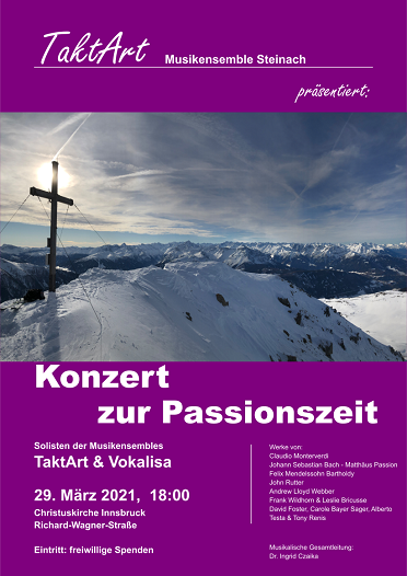 Passionskonzerte haben in der Fastenzeit eine große Tradition. Mit der Konzertreihe "Passion auf Reisen" will das Musikensemble "TaktArt" die Leidensgeschichte Jesu in Erinnerung rufen und in dieser Zeit vor Ostern lebendig machen. Sorgfältig wurde von Dr. Ingrid Czaika und Mag. Pierre Charles Kolozs ein Programm zusammengestellt, das neben Werken aus der Matthäus Passion von J.S. Bach auch Werke von Felix Mendelssohn Bartholdy, Claudio Monteverdi und John Rutter beinhaltet. Mit Kompositionen von Andrew Lloyd Webber, Frank Wildhorn, Leslie Bricusse und David Foster zeigt "TaktArt", dass auch mit moderneren Werken an das Leiden Jesu erinnert werden kann. Die musikalische Gesamtleitung trägt Dr. Ingrid Czaika.